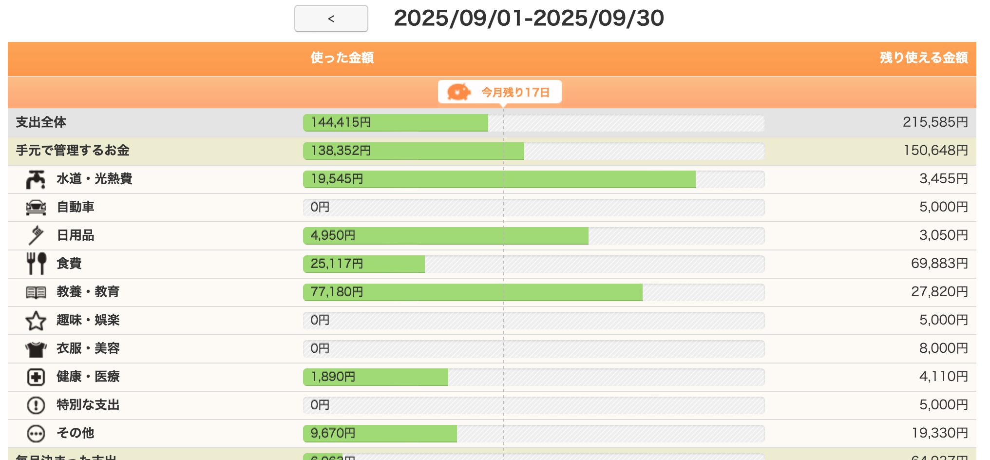 9月の残高:気をつけるべきは教育費、日用品、食費